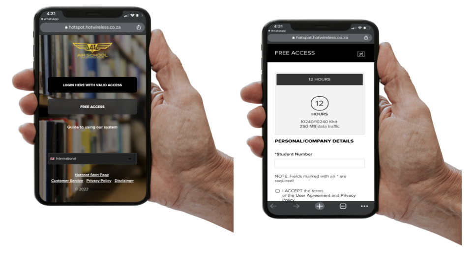 Once the student connects to your WiFi ssid, for example 43 Air School Free WiFi  an automated Captive Portal opens via a link on the students laptop or device. The student could then use the 250MBs complimentary access of the day. Or login with a voucher which can be purchased at the pilot shop. Voucher sizes vary from 40 to 400GBs and can also be used between the busses and hostel The students all get throttled at 10mbps upload and download preventing congestion of the fibre and LTE uplinks.